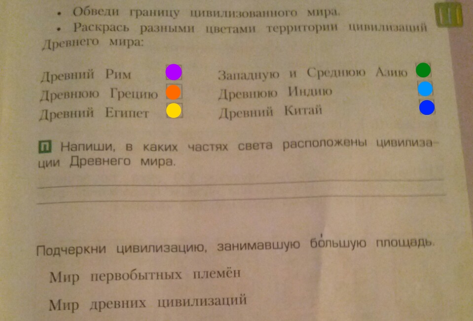Любыми раскрась но вообще Рим синим, Грецию серым, Египет жёлтым, Азию оранжевым или можешь белым так и оставить, Индию коричневым, Китай красным)Нажми на картинку и увидишь