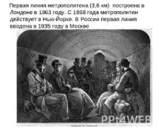 Метрополитен Первая линия метрополитена (3, 6 км) построена в Лондоне в 1863 году. С 1868 года метрополитен действует в Нью-Йорке. Строительство осуществляла компания «Metropolitan Railways» (англ. «Столичные железные дороги»). От этого названия произошло собственно слово «метрополитен», употребляемое сейчас во многих странах. На первой линии метро было 7 станций, а поездка длилась 33 минуты. Вагоны имели газовое освещение, которое, по сообщениям "Дейли Телеграф", было настолько ярким, что можно было без труда читать газету. В день открытия 6 локомотивов, тянущих по 4 вагона, отправлялись через каждые 15 минут и сделали в общем итоге 120 поездок в обе стороны и перевезли за это время 30 тысяч пассажиров. Удобство этого вида передвижения превзошло все ожидания, и в том же 1863 году было принято решение о строительстве в Лондоне кольцевой линии протяжённостью 30 км. Она открылась 1 октября 1868 года. Таким образом, впервые появилась возможность пересесть с одной подземной трассы на другую. Поначалу люди спускались в метро на лифтах, но с изобретением эскалатора в 1911 году, число лифтов начало сокращаться. Один эскалатор способен заменить пять лифтов. Эскалаторы положили конец очередям на станциях лондонского метро. В России первая линия метрополитена была торжественно открыта в Москве 15 мая 1935 года. Позже на территории Советского Союза метрополитены были открыты также в Ленинграде (1955), Киеве (1960), Тбилиси (1966), Баку (1967), Харькове (1975), Ташкенте (1977), Ереване (1981), Минске (1984), Горьком (1985), Новосибирске (1986), Куйбышеве (1987) и Свердловске (1991). Ежедневно по 12 линиям метрополитена, общей протяженностью 317, 5 км со 190 станциями пропускается более 10 тысяч поездов. В среднем услугами Московского метрополитена каждый день пользуются более 8 миллионов пассажиров. И это - наивысший показатель в мире!